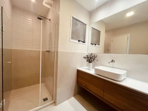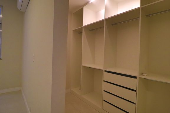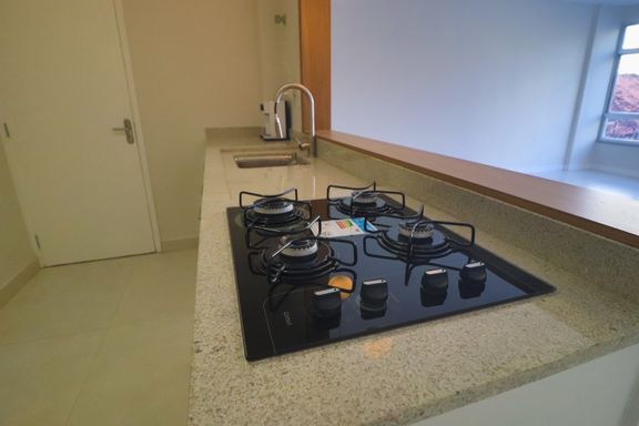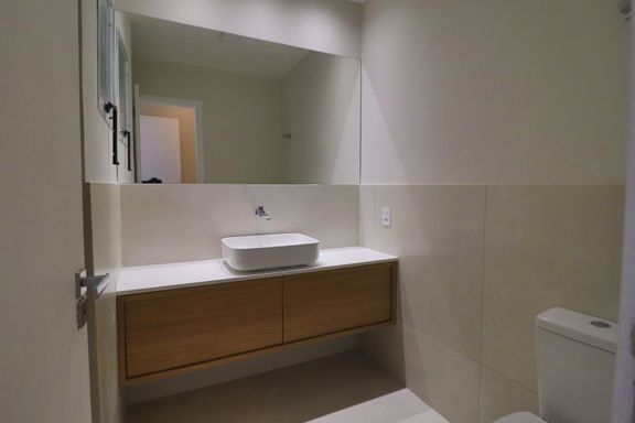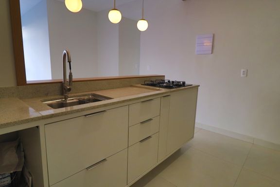 São 3 quartos, um deles suíte com closet e armários; sala ampla dividida em dois ambientes; cozinha com armário e bancada com cooktop; área e banheiro de serviço; banheiro social.