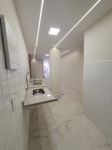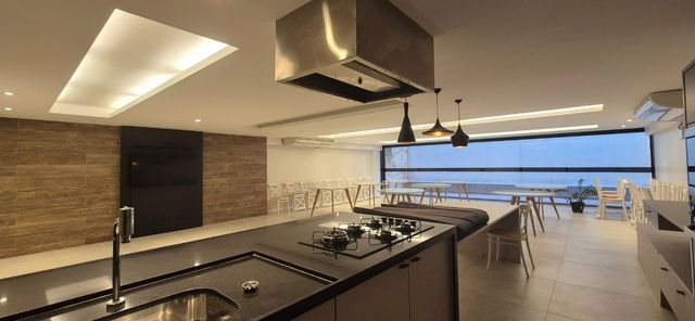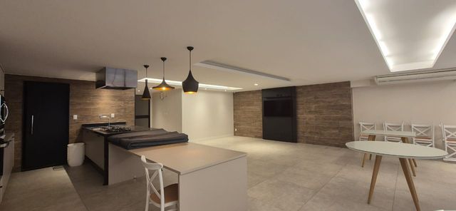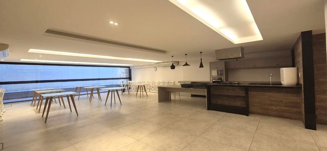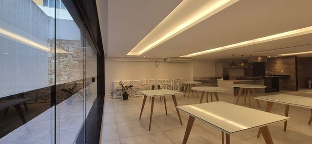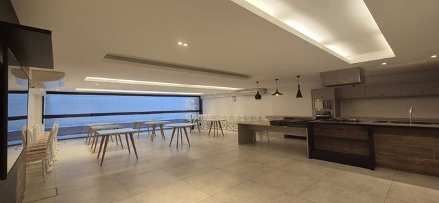 Condomínio com portaria 24 horas, salão de festas e hall de entrada reformado por arquitetos.