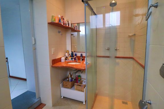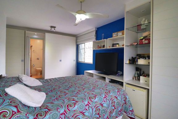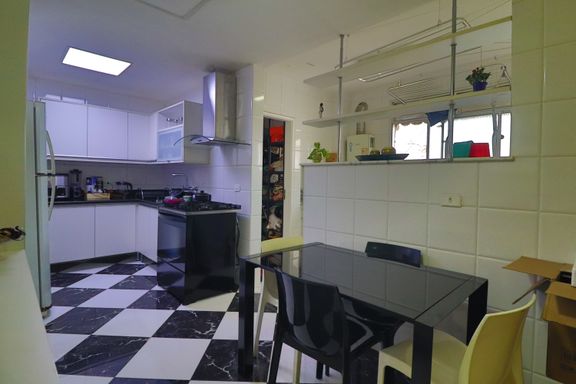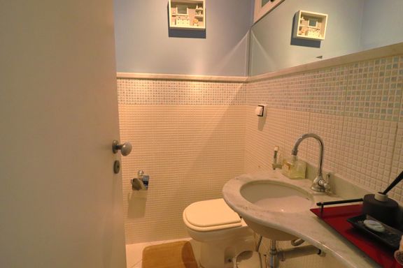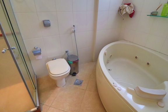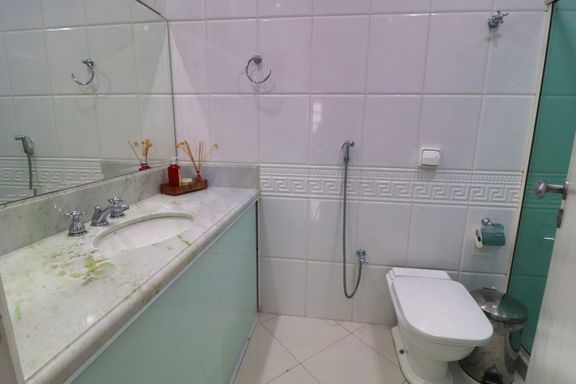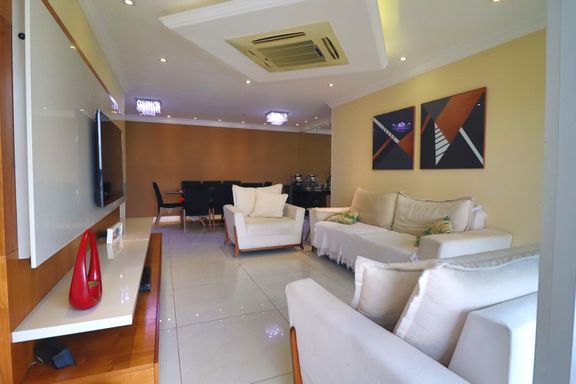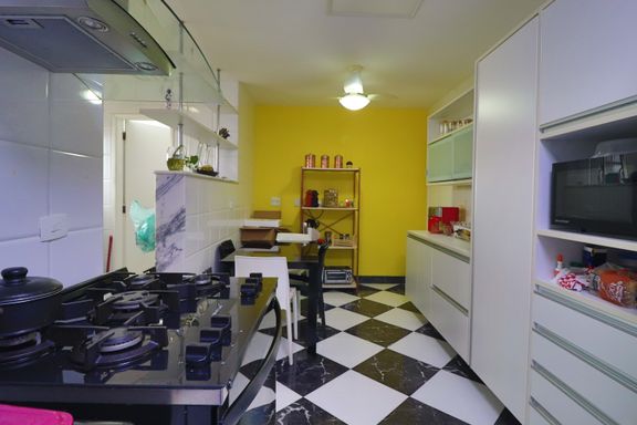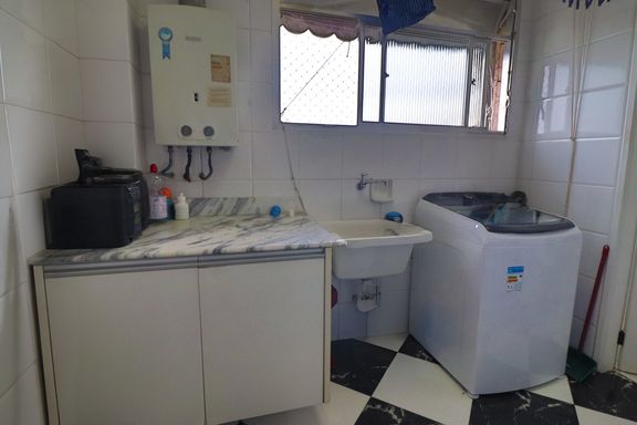 Possui 3 quartos com armários embutidos, um deles suíte com banheira de hidromassagem; sala dividida em dois ambientes; lavabo; varanda com vista indevassada; banheiro social; cozinha com armários planejados; lavanderia; quarto e banheiro de serviço.