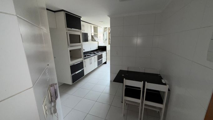 Apartamento 3 quartos, sendo 1 suíte com varanda, uma ótima cozinha já com armários planejados, área de serviço, dependência de empregada com banheiro, sala ampla com varanda toda fechada com cortina de vidro e vista lateral da praia, banheiro social.