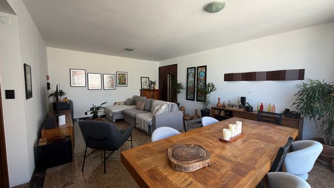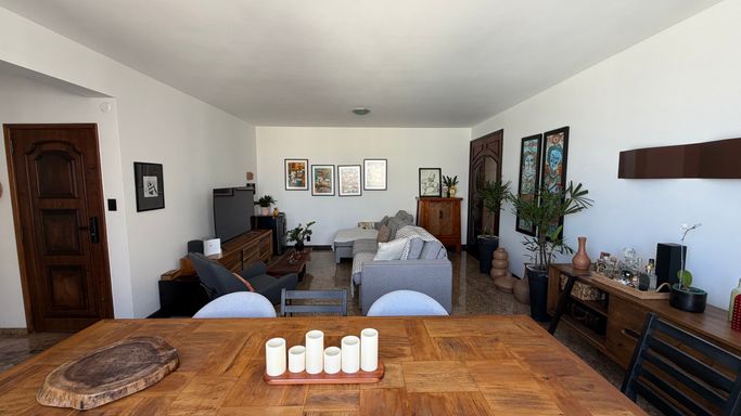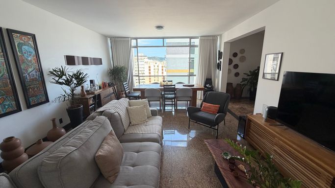 Sala é ampla, e muito iluminada, proporcionando um ambiente perfeito para receber amigos e familiares, além de contar com uma agradável vista parcial para o mar.