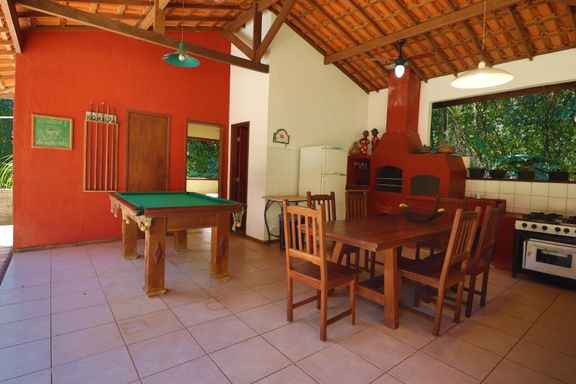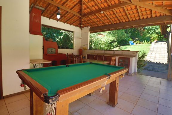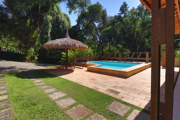 Área de lazer com piscina, sauna, área gourmet com churrasqueira, fogão a lenha, anexo com uma suíte.