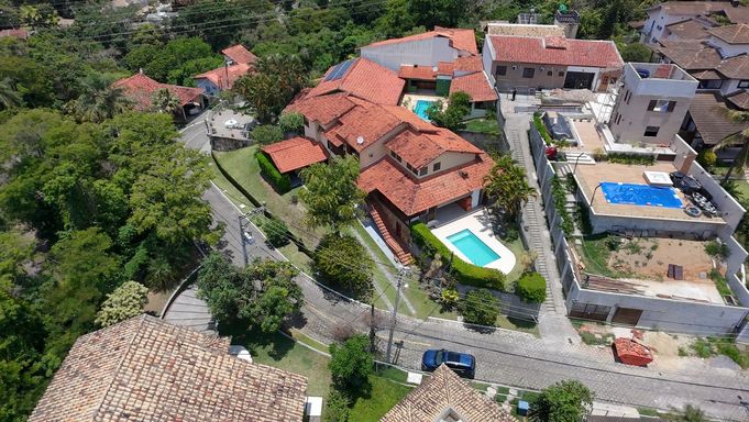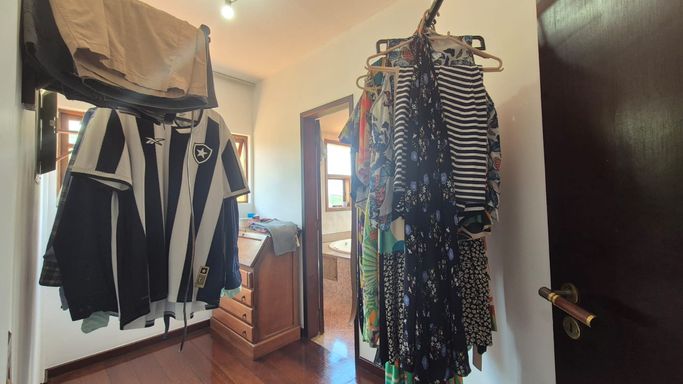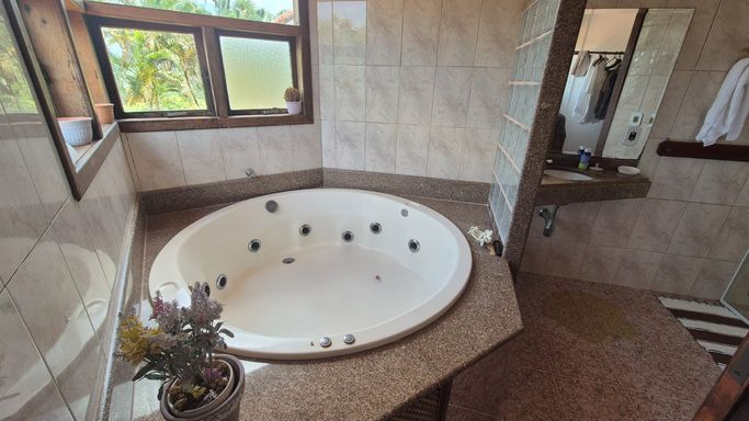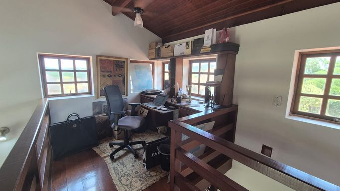 banheiro social; 3 quartos, um deles é uma suíte com varanda, closet e hidromassagem; mezanino, onde há um escritório.
