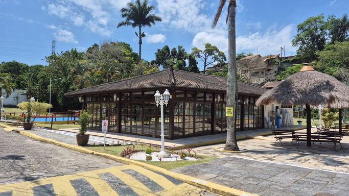 Área de lazer com piscina, sauna, churrasqueira com área gourmet e forno a lenha.