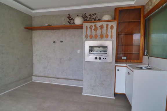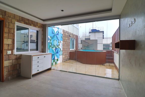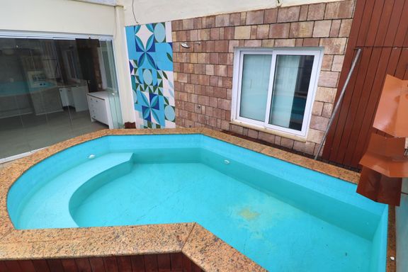 Segundo pavimento: Suíte com closet; quarto com armário embutido; churrasqueira com área gourmet e piscina.